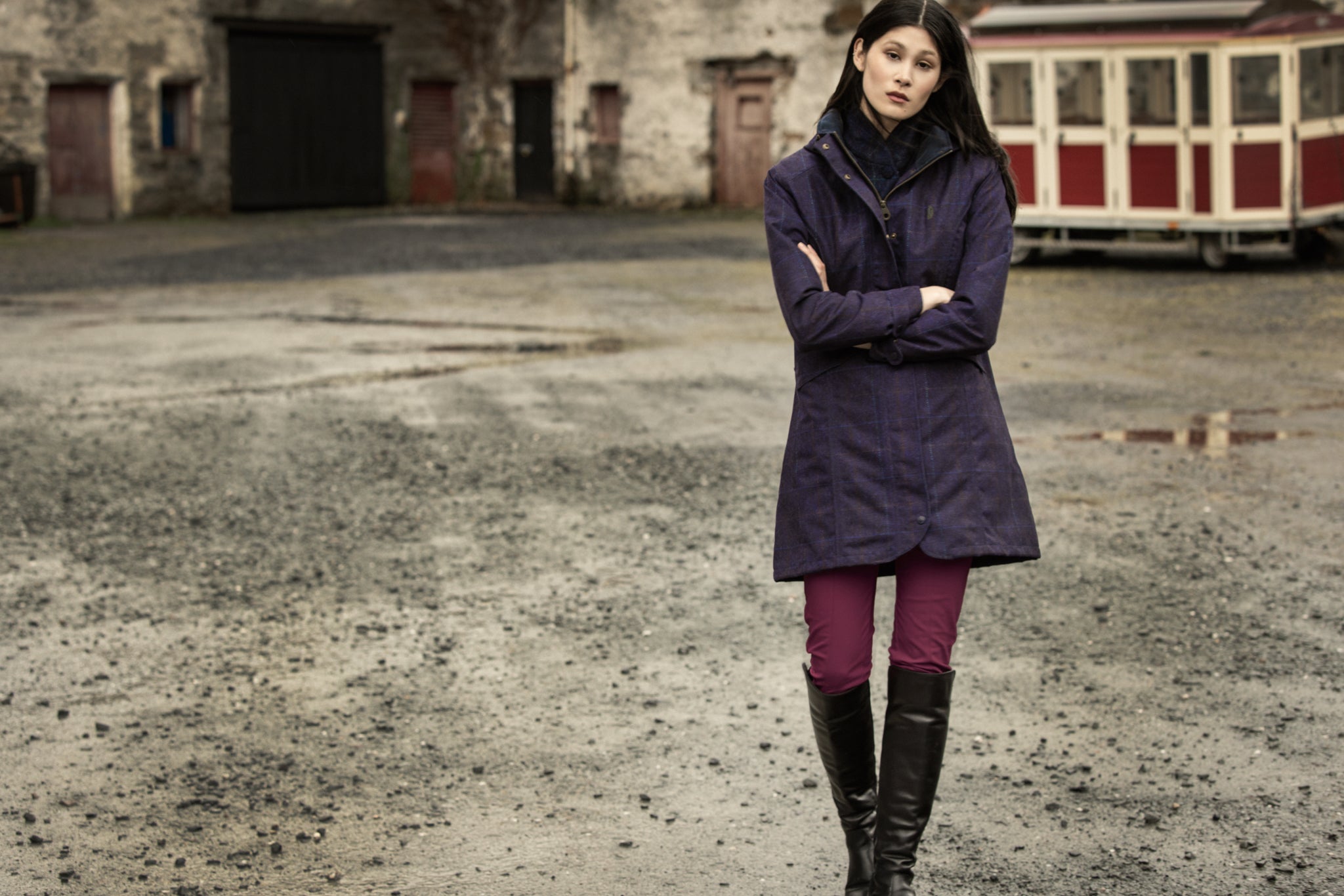 Woman leaning against a vintage green vehicle in a breathable waterproof coat